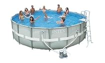 Enjoy some fun in the sun with the Intex Round Ultra Frame Swimming Pool. This swimming pool is the next step in metal frame swimming pool and beauty. This 18' x 52" round swimming pool has a unique shape that is stronger than traditional round metal frames. The easy-to-assemble frame and round shape allow for the pieces to fit together so smoothly and securely that no separate locking pins are needed keeping your pool looking better than pools with traditional metal frames. This pool includes everything you need for a summer of family fun including the pool instructional DVD ground cloth pool cover ladder deluxe maintenance kit surface skimmer volleyball set and the Intex Krystal Clear Saltwater System that features a 2000 gallons per hour filter pump with an automatic 24 hour timer to keep your pool water amazingly clean.