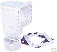 Skimmer with standard mouth for aboveground pools. Includes: complete skimmer with 1-1/2" threaded connection 1-1/2" inlet fitting 3/4" hydrostream fitting and skim vac plate with elbow.