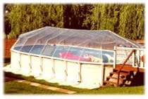 21' X 44' Oval Above Ground Swimming Pool Sun Dome. This fits 21' X 41' Oval Above Ground Pools with 26 Top Rails Uprights Panels. This Dome comes with 1 door and 3 windows. Warming and heating is one of the key benefits - it warms the air(40 degrees) and water with solar heat up to 20 degrees Fahrenheit. It also protects your pool from leaves bugs debris and early spring or late summer breezes. Moreover because your pool is protected you cut down on the use of chemicals and expensive cleaning costs. Tailor Made Vinyl and Aluminum Enclosure The Fabrico Sun Dome is a heavy 12-gauge vinyl pool enclosure that is supported by a series of aluminum tubes. The crystal clear cover is heat-sealed to fit the tubes based on pool specifications to provide a tailored fit for every pool size. Sturdy Double-Zipper Doors and Windows Each pool enclosure has one door opening with two heavy duty two-sided nylon zippers as well as one or more fiberglass screened window flaps/openings for flow-thru ventilation. Both doors and windows come with vinyl tabs to hold flaps in place. Solid and Secure Enclosure Framework The bottom edge of the enclosure is 24-gauge - or double thickness - and has a series of grommets. Neoprene shock cords are then attached to the grommets and hooked onto the base of the dome. This system ensures that the vinyl enclosure is held securely over the pool framework - making the Sun Dome an extra strong framework.